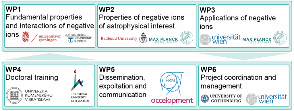 To structure the research and training activities, PANIONS is organised into six work packages. While each work package addresses specific objectives, the programme is designed to foster strong interaction and collaboration among doctoral candidates through joint activities and secondments. Together, the combined results of PANIONS will constitute a major contribution to the understanding of negative ions and their role in the cosmos, with lasting impact on fundamental science and applied technologies.