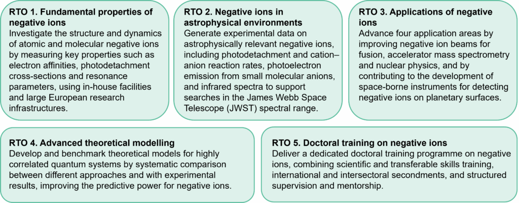 PANIONS implements its objectives through 14 independent but highly collaborative doctoral research projects. These projects span both theoretical and experimental research, addressing systems ranging from the simplest negative ion, H⁻, to complex negatively charged clusters. Each doctoral project contributes to at least two of the research objectives, ensuring strong cross-linkages while minimising interdependencies and risk.